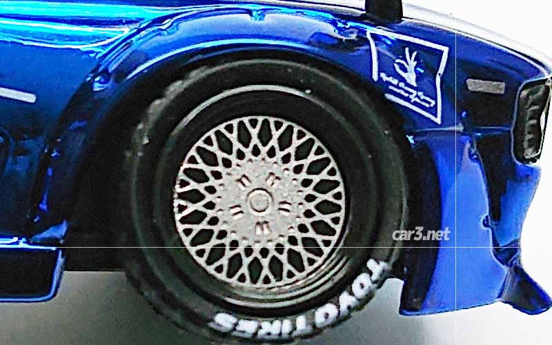 フェンダーはフロントで+4cm(片側)、リアで+9cm(片側)というワイドさ。ミニカーになっても、これほどのワイドさです。